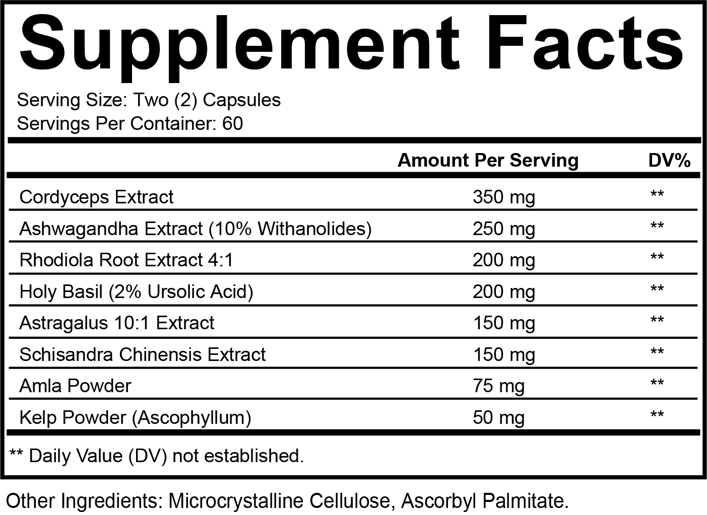 Cordyceps Extract (350 mg) — A powerhouse adaptogen traditionally used to combat fatigue, enhance oxygen utilization, and support balanced stress and energy levels.*