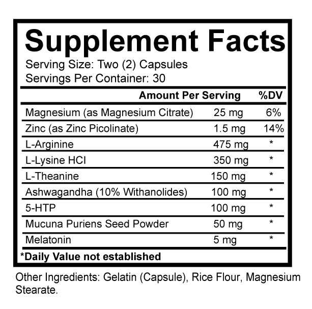 L-Arginine & L-Lysine HCl (825 mg combined) — Synergistic amino acids that help regulate stress response and support healthy cortisol rhythms for balanced relaxation.*